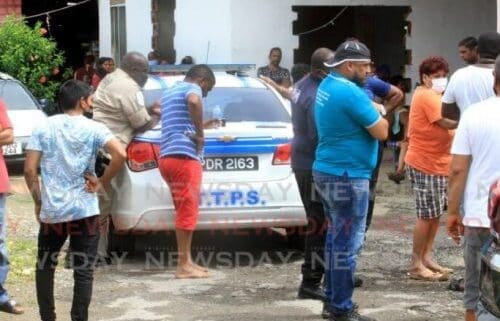 Relatives and friends gather outside the Jagessar Street, Aranguez home of Kadeem Ali who was crushed to death by a falling gate. – Angelo Marcelle