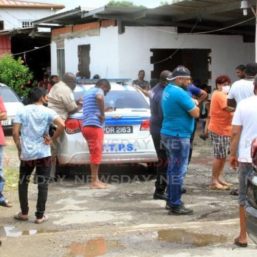 Relatives and friends gather outside the Jagessar Street, Aranguez home of Kadeem Ali who was crushed to death by a falling gate. – Angelo Marcelle