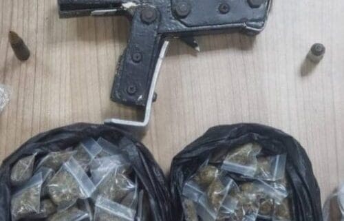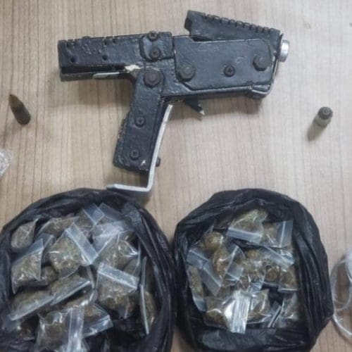 SEIZED ITEMS: The homemade pistol, ammunition and packets of compressed marijuana seized by Northern Division police in two separate anti-crime exercises on Thursday night. PHOTO COURTESY TTPS –