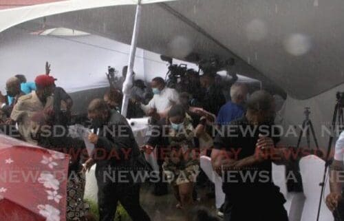 Newsday understands that the guttering of the building was not able to divert all the water running off the roof, causing the water to run straight onto the tent and pool there. In addition, the centre pole of the tent was not anchored to the ground. Two men were observed using buckets to bail water off the top of the tent. Shortly afterwards it was noted that the tent poles were beginning to bend, and most people moved out of the tent, including government ministers and employees seated at the front.