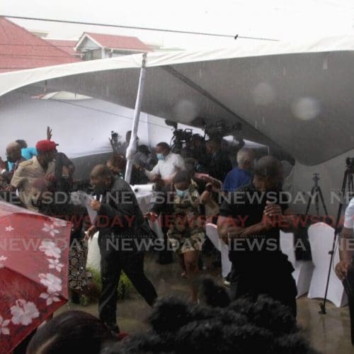 Guests, media and government officals scatter as a tent collapses at the re-opening of the Jennifer Shaw Transitional Home for Young Women, Henry Street, Port of Spain on Tuesday. – ROGER JACOB