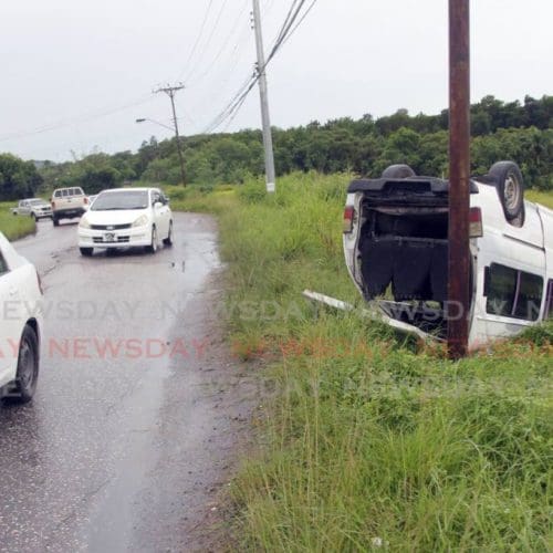 A vehicle transporting school children overturned along the Southern main road, Claxton Bay near Pranz Gardens. Photo by Lincoln Holder