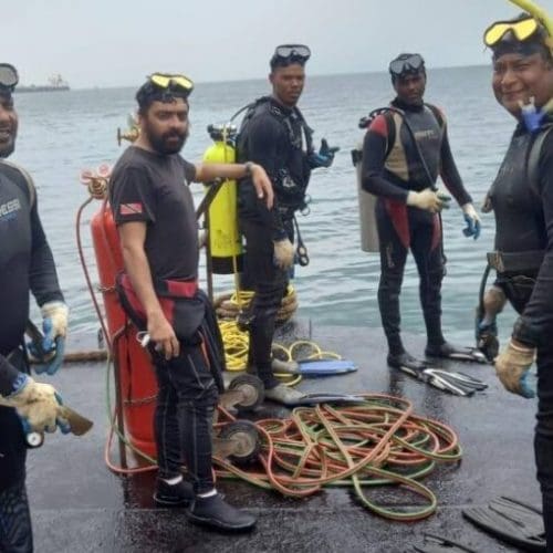 The five divers employed by a private company hired by Paria Fuel Trading Co Ltd to do maintenance work on a 30-inch pipeline in one of the last photos taken at Pointe-a-Pierre on February 25. From left are Christopher Boodram, who survived,