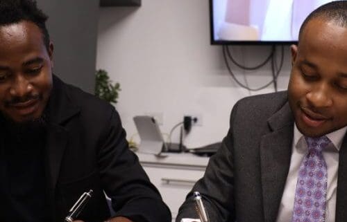 iCreate Founder and CEO Tyrone Wilson (left) and attorney and lead investor Able-Don Foote sign the convertible debt deal agreement.