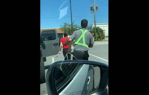 In a video by Molly Kelner, the worker, Mykel Gordon, can be seen wrestling the suspect, in a gray T-shirt, as the woman stands by holding the child.