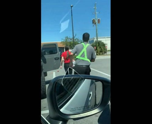 In a video by Molly Kelner, the worker, Mykel Gordon, can be seen wrestling the suspect, in a gray T-shirt, as the woman stands by holding the child.