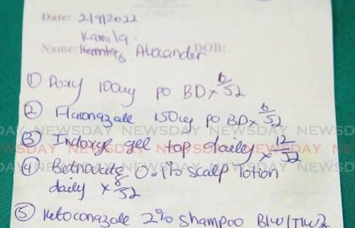 Alexander’s mother said she got treatment at the Eric Williams Medical Sciences Complex up until last March, when she sought the help of a dermatologist. The dermatologist prescribed a combination of antibiotics, creams, shampoos and lotions that has shown signs of clearing up the infections, but the mother said, the treatment is very expensive – with one month’s treatment costing about $1,500. Alexander’s mother said the antibiotics alone are worth $900.