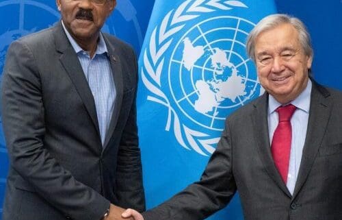 Secretary-General António Guterres (right) meets with Gaston Alphonso Browne, Prime Minister and Minister for Finance, Corporate Governance and Public Private Partnerships of Antigua and Barbuda.