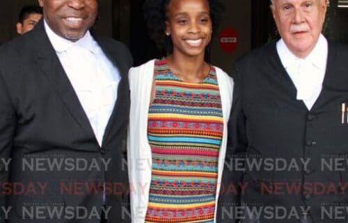 COURT WIN: Gymnast Thema Williams with her attorneys Martin Daly, SC, and Keith Scotland, left, at the Hall of Justice in Port of Spain in November 2018. File photo/Sureash Cholai
