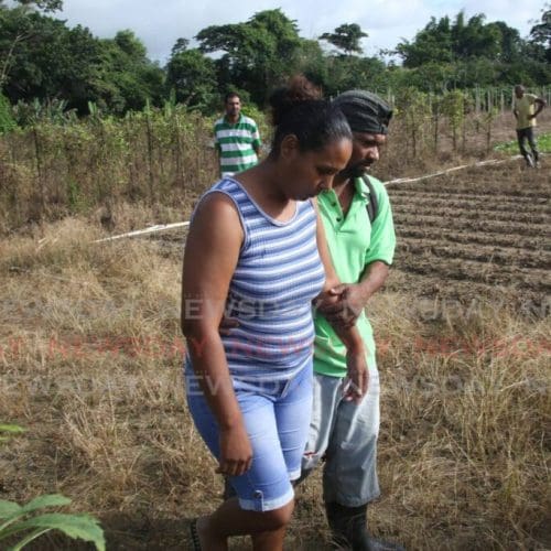 SORROW: A relative of Theresa Lynch is helped by a man out of the area where Lynch’s body was found on Friday on the banks of the Arouca River. PHOTO BY ANGELO MARCELLE –