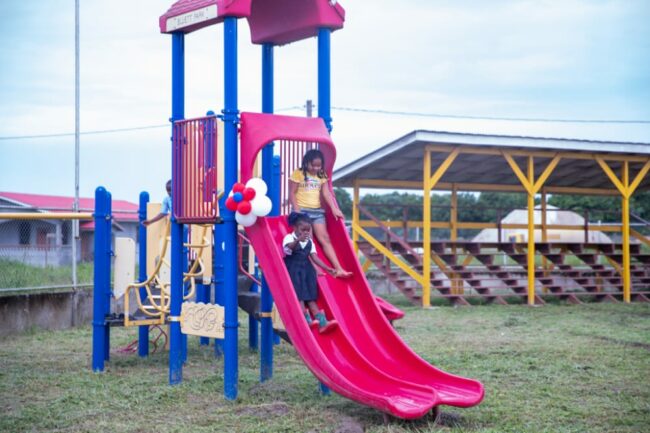 “Food for the Poor’s involvement, in this project here, included the installation of two sets of playground equipment, construction of the double unit concrete sanitary facility which has the rainwater harvesting component, and the construction of the wooden bleacher,” Vincent said.