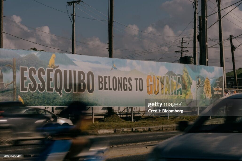 A sign that reads “Essiquibo Belongs to Guyana” displayed at the Madela Eccles roundabout in Georgetown, Guyana, on Thursday, Jan. 25, 2024. The small nation’s economy is the fastest-growing in the world, but the boon has stoked challenges from inflation and a growing wealth gap to the looming threat of conflict with Venezuela. Photographer: Jose A. Alvarado Jr./Bloomberg via Getty Images