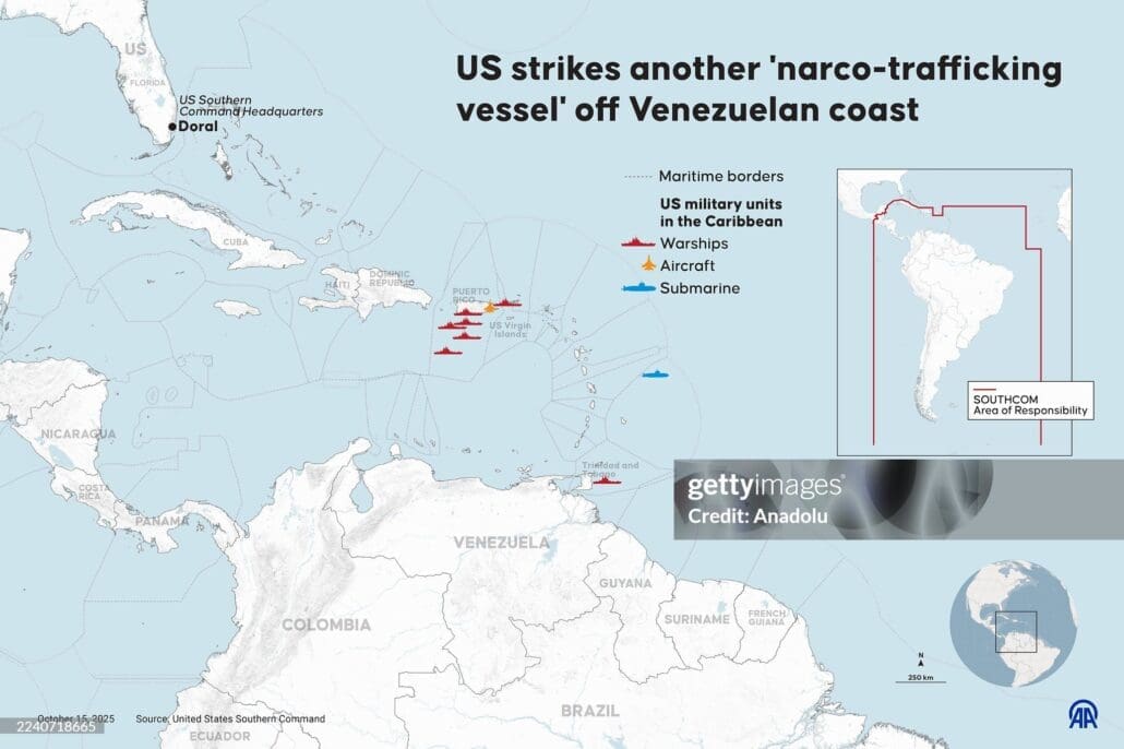 An infographic titled “US strikes another ‘narco-trafficking vessel’ off Venezuelan coast” created in Ankara, Turkiye on October 15, 2025. US President Donald Trump said the US carried out another strike Tuesday on ‘a narco-trafficking vessel’ off the coast of Venezuela. (Photo by Yasin Demirci/Anadolu via Getty Images)