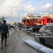 A man walks past a car and damaged buildings October 29, 2025 following the passage the previous day of Hurricane Melissa, in Black River, St. Elizabeth, Jamaica. (Photo by RICARDO MAKYN/AFP via Getty Images)