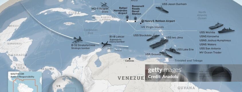 An infographic titled “Major US military deployments in the Caribbean” created in Ankara, Turkiye on November 7, 2025. (Photo by Murat Usubali/Anadolu via Getty Images)