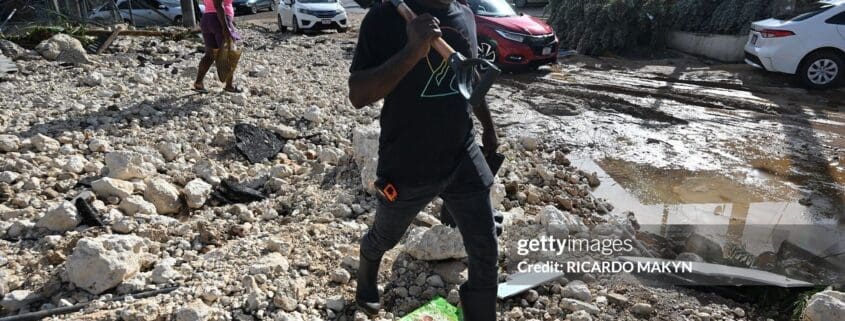 A man walks with a shovel in hand over rubble on Main Street in Santa Cruz, St. Elizabeth, Jamaica on October 29, 2025. (Photo by RICARDO MAKYN/AFP via Getty Images)