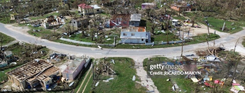 An aerial view shows damaged buildings in the aftermath of Hurricane Melissa in Lewis Town, St Elizabeth, Jamaica, on October 31, 2025. (Photo by RICARDO MAKYN/AFP via Getty Images)