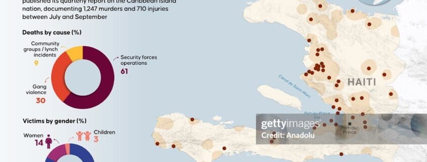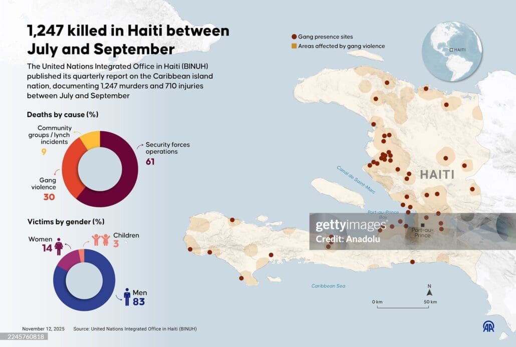 An infographic titled “1,247 killed in Haiti between July and September” created in Ankara, Turkiye on November 12, 2025. The United Nations Integrated Office in Haiti (BINUH) published its quarterly report on the Caribbean island nation, documenting 1,247 murders and 710 injuries between July and September. (Photo by Elif Acar/Anadolu via Getty Images)