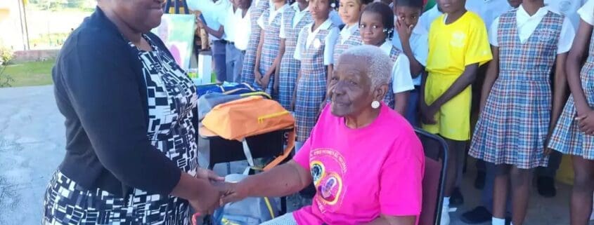 FLASHBACK – Teacher Gen warmly greeted by a community member as schoolchildren stand behind them during a tribute event in Potters Village, Antigua. The gathering reflected her decades of service as a beloved educator whose influence shaped generations.
