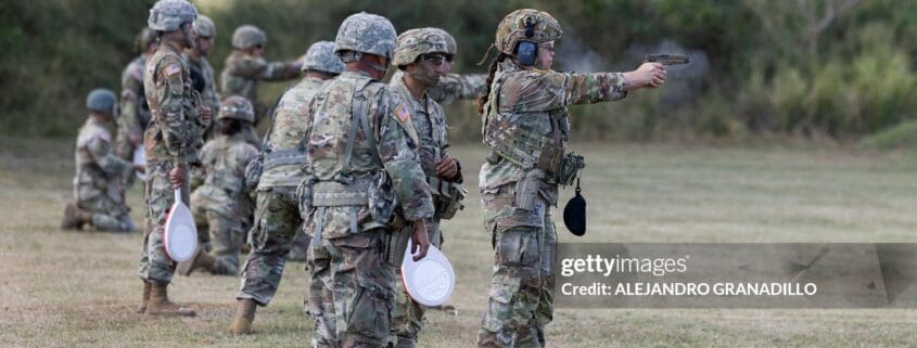 US Army Reserve soldiers take part in a live-fire pistol training exercise at Camp Santiago in Salinas, Puerto Rico, on January 10, 2026. (Photo by Alejandro GRANADILLO / AFP via Getty Images)