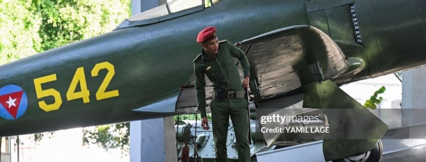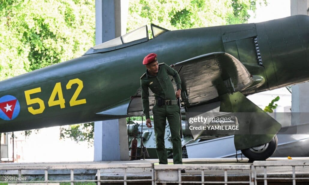 A guard stands in front of an airplane at the Revolution Museum, which is dedicated to preserving the history and legacy of the Cuban Revolution, in Havana on January 13, 2026. (Photo by YAMIL LAGE / AFP via Getty Images)