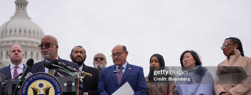 The announcement came as Representative Bennie Thompson, a Democrat from Mississippi, second left, spoke during a news conference on a fatal shooting in Minneapolis by an Immigration and Customs Enforcement (ICE) agent, outside the US Capitol in Washington, DC, US, on Wednesday, Jan. 14, 2026.Minnesota officials are suing over the “unprecedented surge” of US immigration authorities in the state, taking the Trump administration to court days after a federal agent shot and killed a Minneapolis woman. Photographer: Kent Nishimura/Bloomberg via Getty Images
