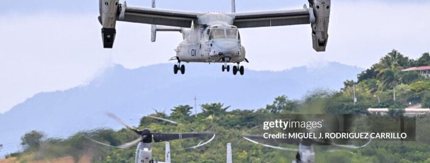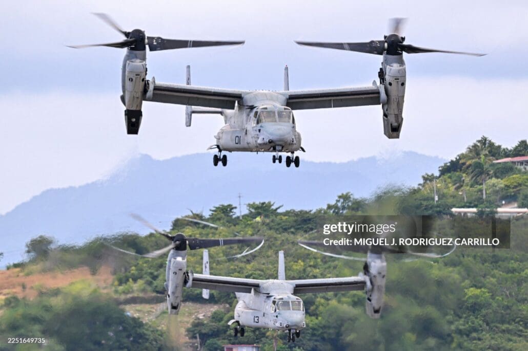 MV-22 Osprey aircraft are parked on the tarmac at Mercedita Airport in Ponce, Puerto Rico, on January 15, 2026. (Photo by Ricardo ARDUENGO / AFP via Getty Images)
