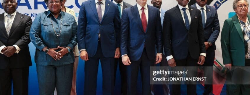 US Secretary of State Marco Rubio participates in a family photo with Caribbean Community (CARICOM) heads of government in Basseterre, Saint Kitts and Nevis, February 25, 2026. Rubio is meeting with Caribbean leaders seeking a common line on Venezuela and pressure on Cuba. He’s also addressing President Donald Trump’s priorities, including combating illegal immigration, drug trafficking and regional security. (Photo by Jonathan Ernst / POOL / AFP via Getty Images)