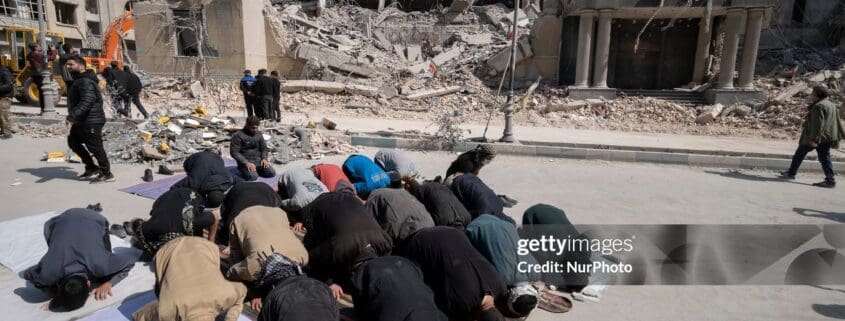 A group of Iranian men prays in an area that is targeted in U.S.-Israeli attacks in Tehran, Iran, on March 4, 2026. (Photo by Morteza Nikoubazl/NurPhoto via Getty Images)